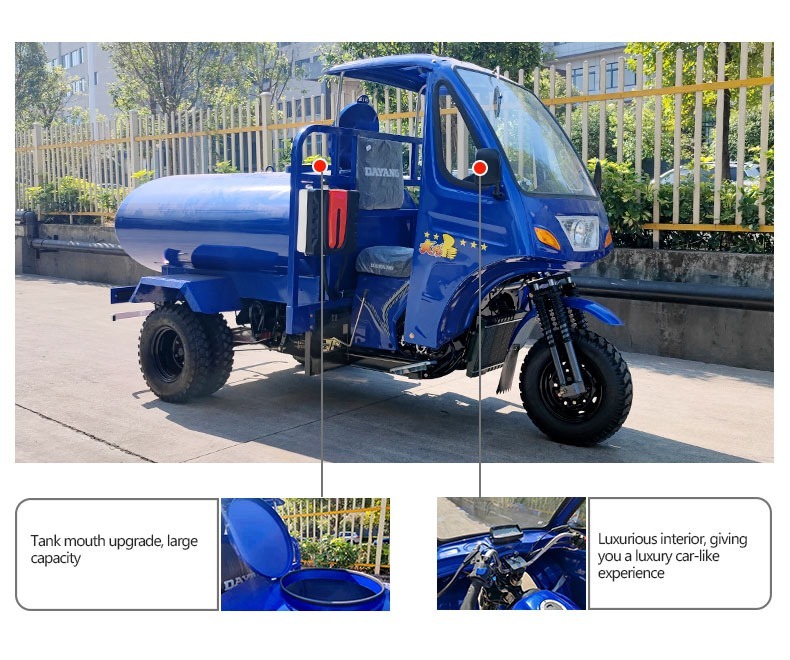 200cc 250cc tank tal-ilma/triċiklu tat-tank taż-żejttintuża ħafna fiż-żoni rurali, żoni urbani fl-Afrika. 3-triċiklu tal-muturi bir-roti għat-trasport bl-ilma jew għat-trasport taż-żejt
